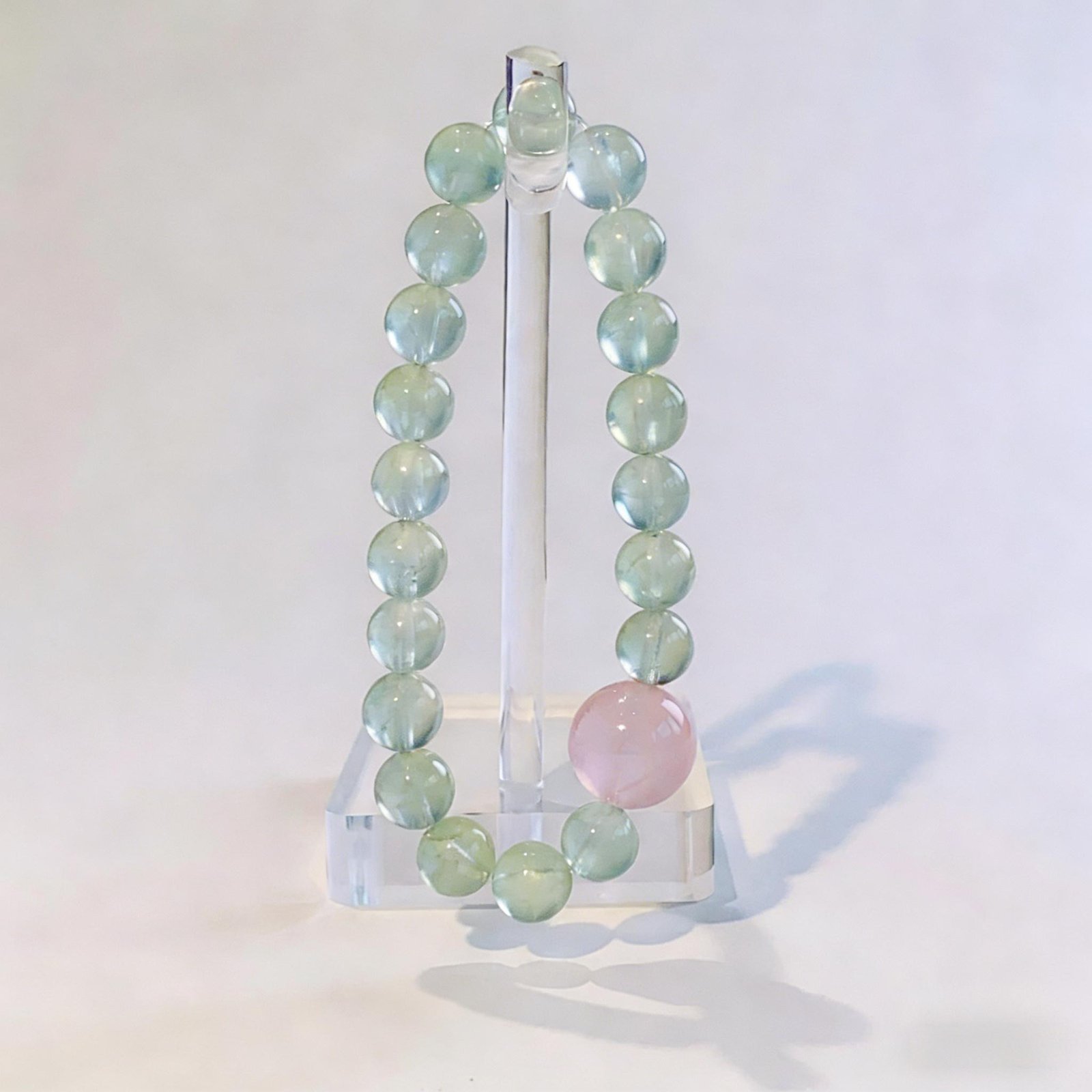 This stretch bracelet features Grade A 9mm ice-clear green prehnite beads with a 12mm rose quartz center. It delivers dual heart chakra healing: prehnite brings hope, new opportunities, and stress relief, while rose quartz attracts love, boosts social harmony, and emotional balance. Fits 15–18cm wrists; fresh, versatile style ideal for everyday wear, ethically sourced natural gemstones.