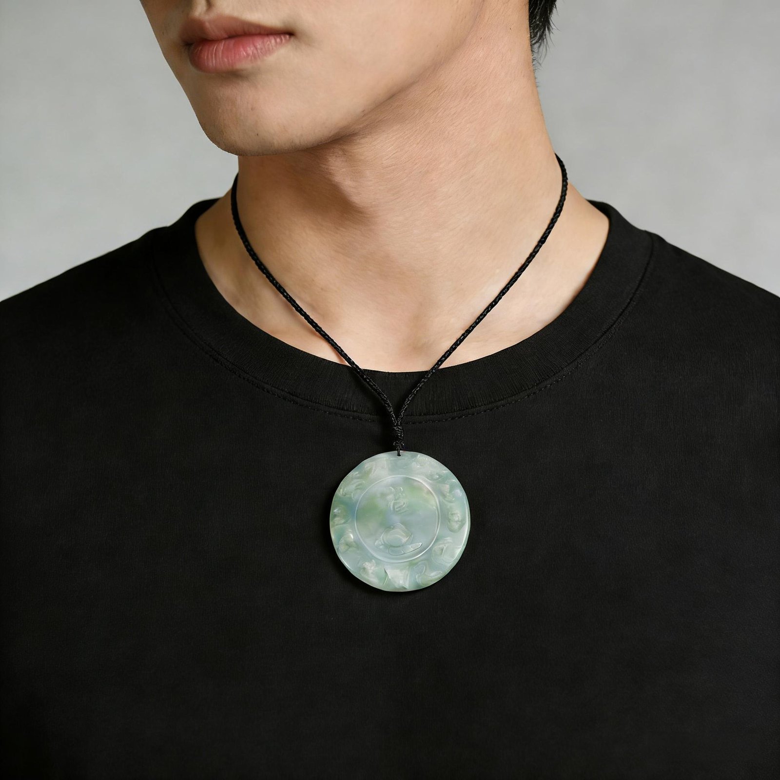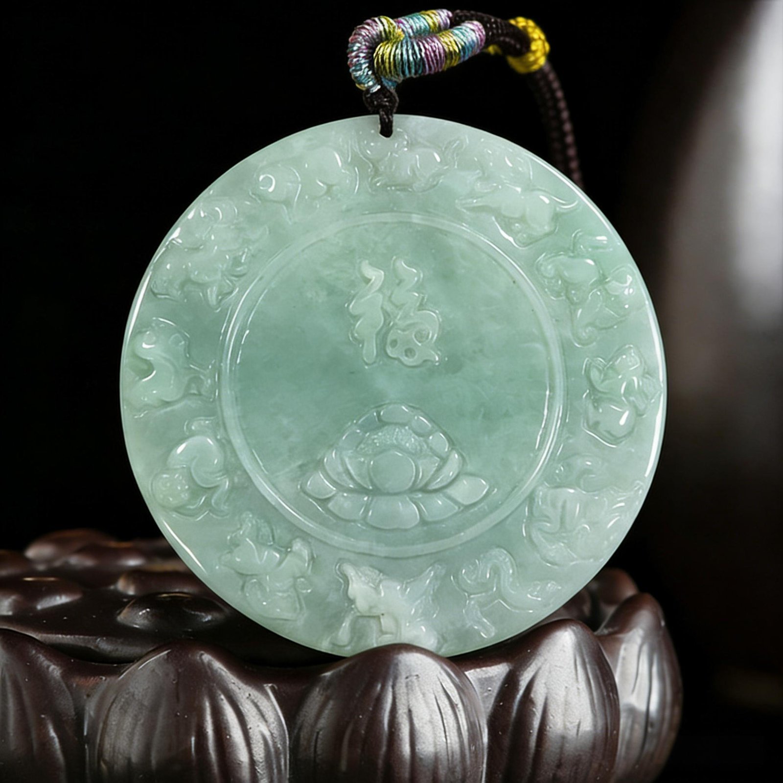 This hand-carved Grade A natural jadeite pendant is a meaningful blend of art and tradition: its rim features all 12 Chinese Zodiac animals (representing life’s cycles), while the center’s lotus and “good fortune” character symbolize purity and luck. Revered for 5,000+ years as the “Stone of Heaven,” this icy, luminous amulet doubles as a unique statement piece and a personal talisman to attract harmony and abundance. Each untreated jadeite piece is one-of-a-kind, with subtle natural variations that make your pendant truly yours.