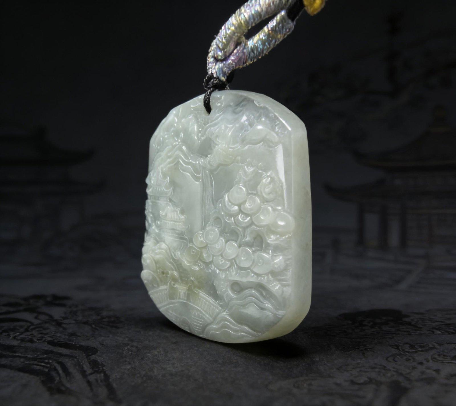 This pendant features an intricate carving of mountains, flowing water, and a traditional pavilion: