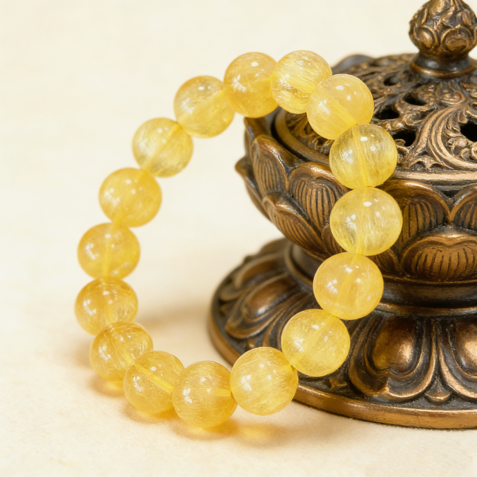 - Remove before heavy activity or prolonged water exposure (to preserve the bead’s luster and silk-like inclusions).