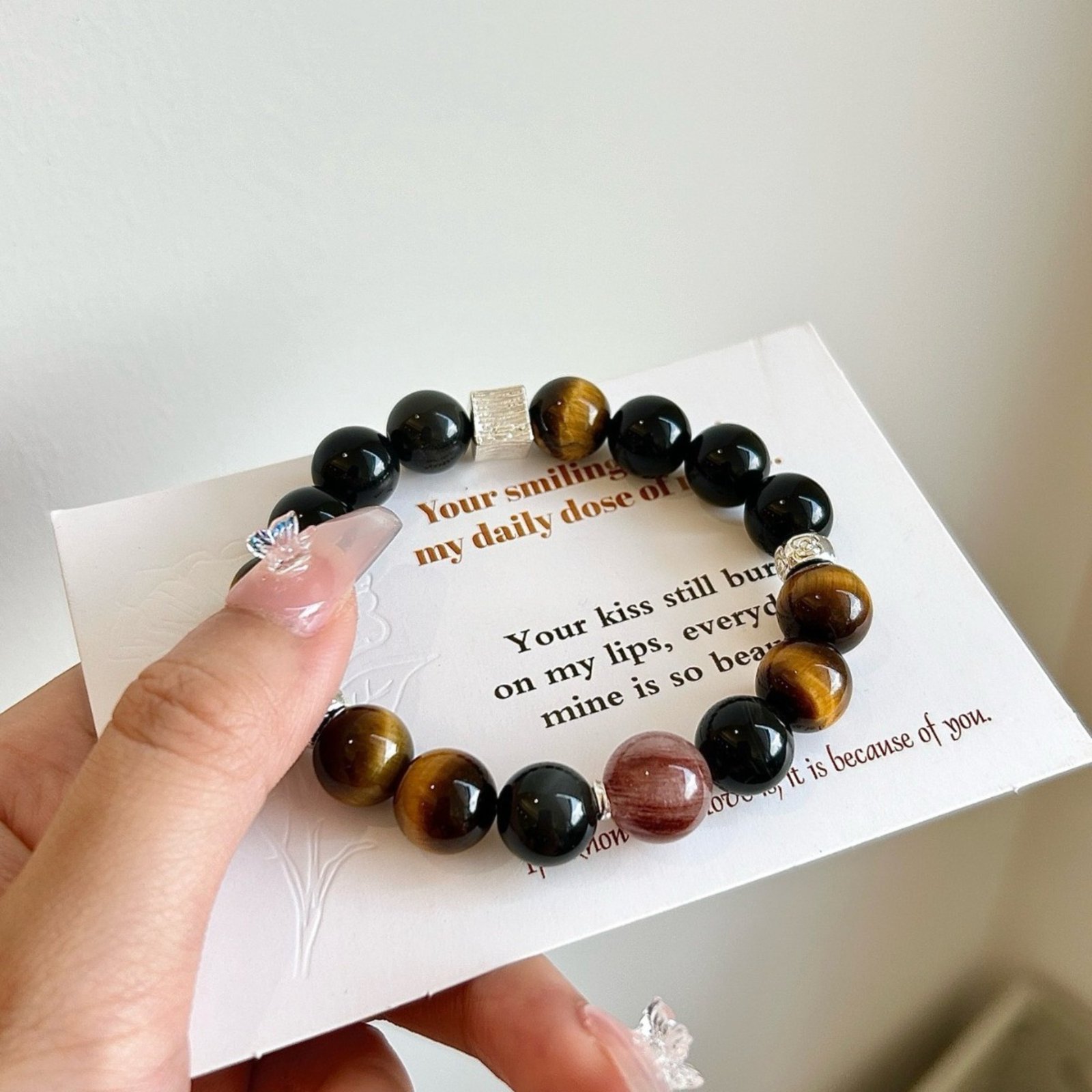 - Material: Natural Grade A Obsidian + Grade A Tiger’s Eye + Grade A Red Copper Rutilated Quartz + Silver-Toned Metal Accents