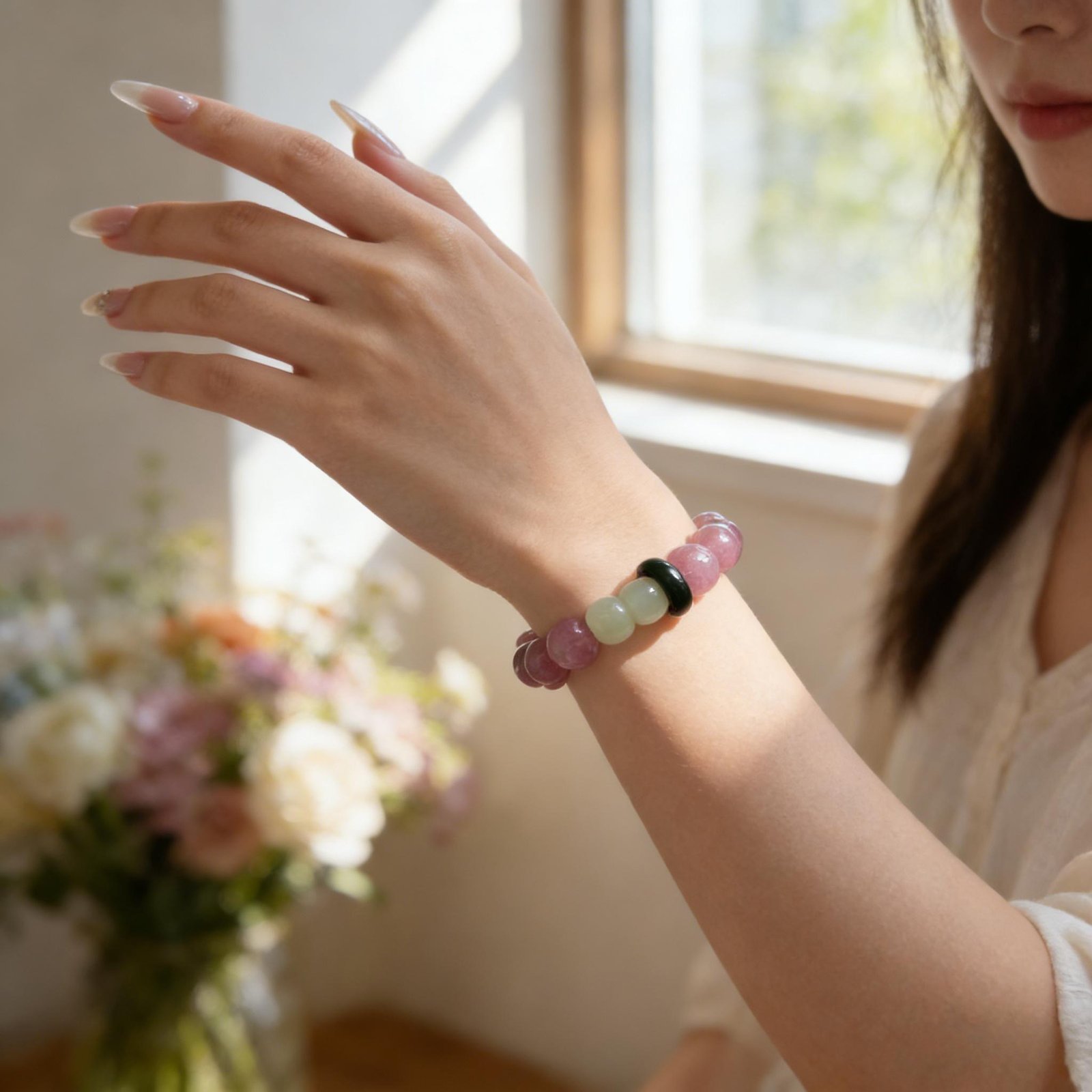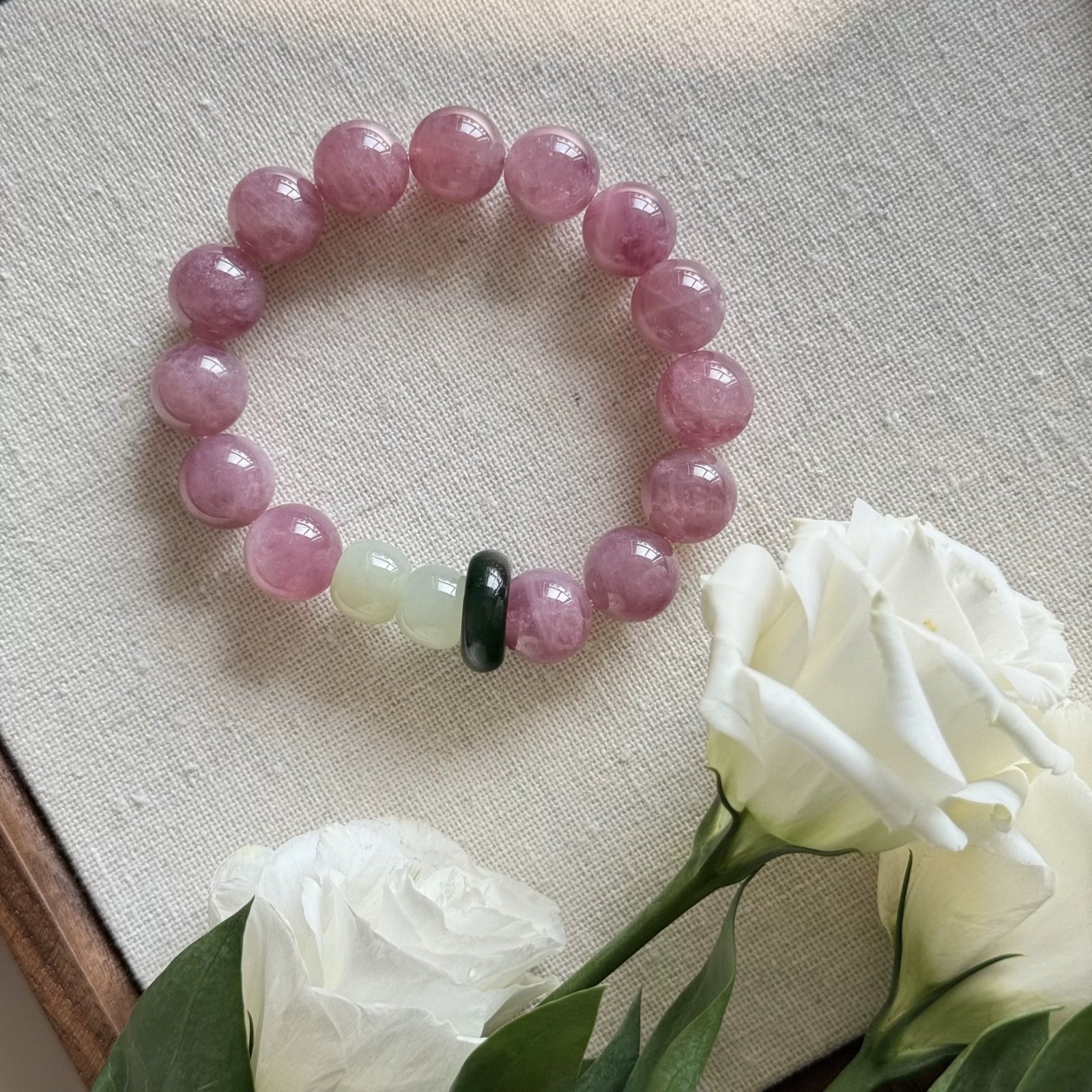 - Bead Size: ~11mm (Pink Quartz) + ~10mm (Jade accents) (manual measurement, slight variation)