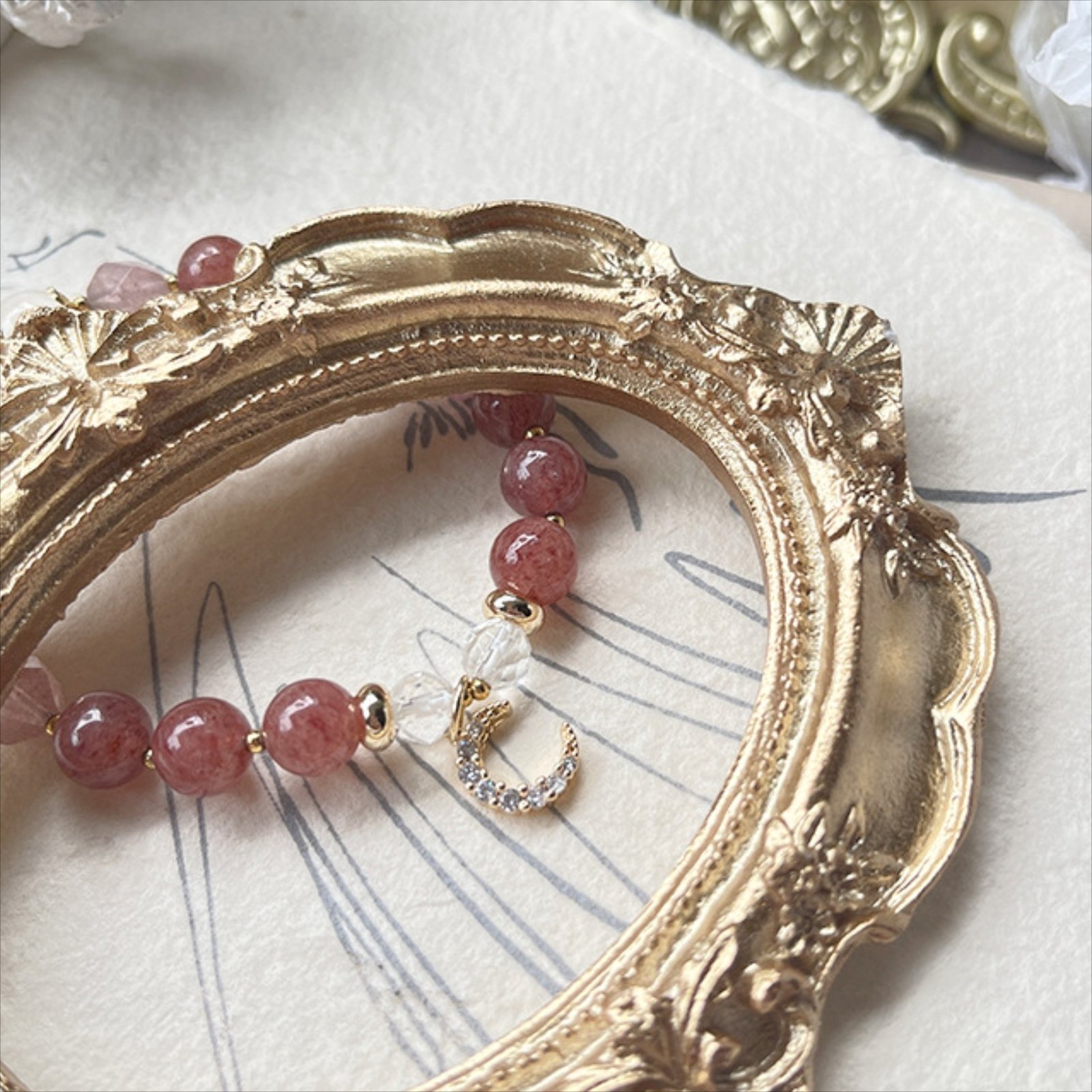 - Material: Natural Grade A Strawberry Quartz + Grade A Clear Quartz + Moon Zircon Charm + Gold-Toned Accents