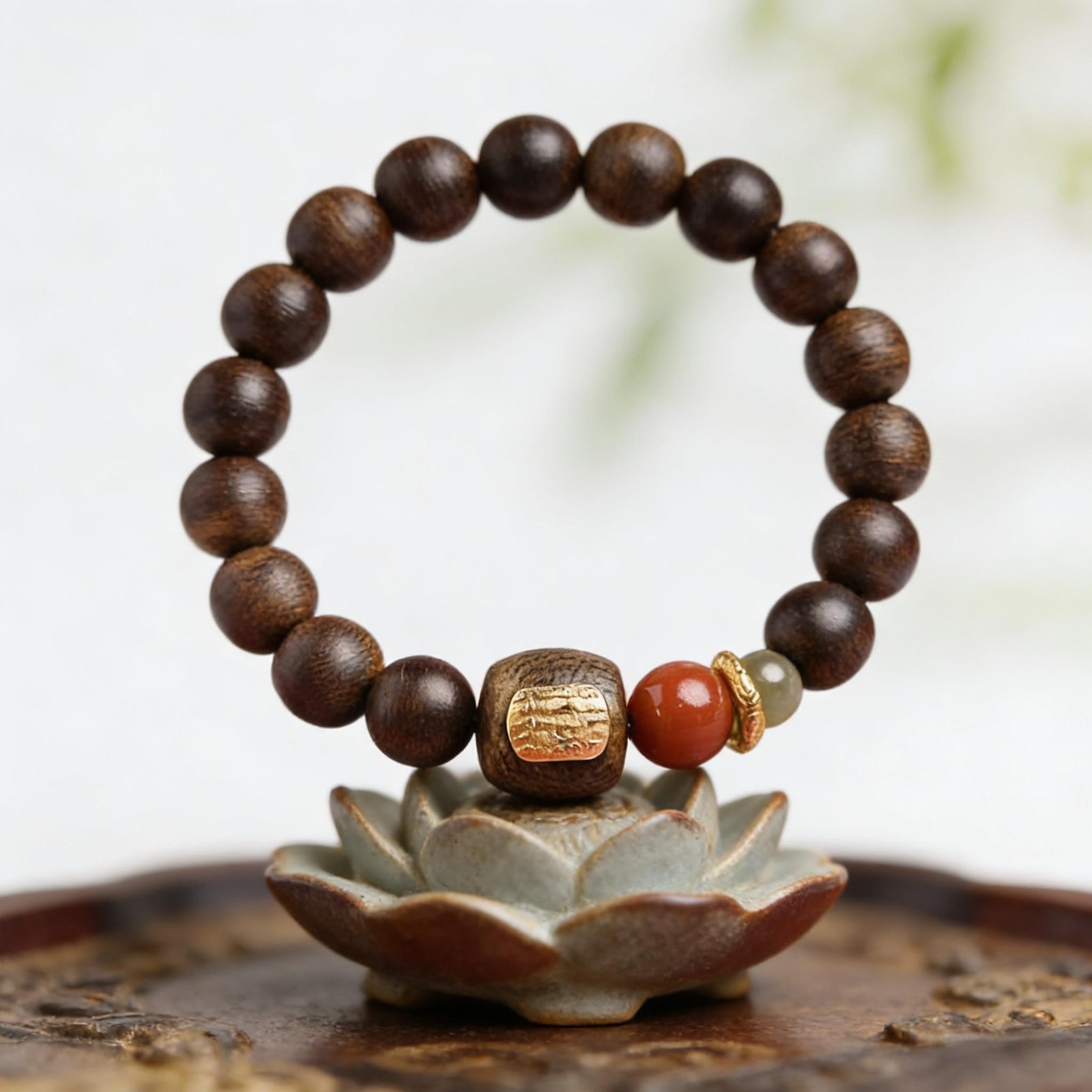 Premium Meditation Agarwood Bracelet 8mm – Handcrafted Wild “Jadeized Nine” Beads with Red Agate Accent | Calm, Abundance & Root Chakra Grounding Jewelry