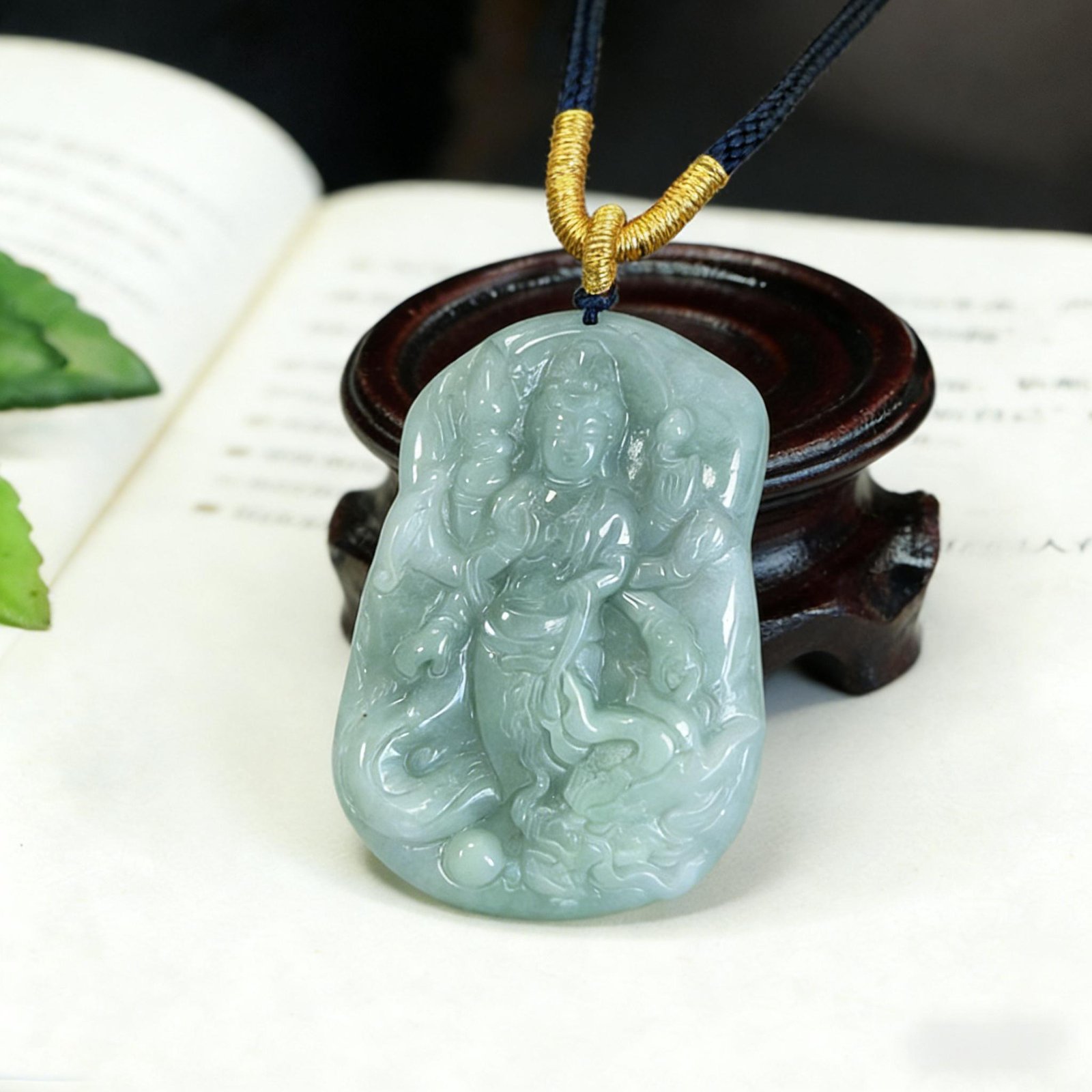 This hand-carved Type-A natural jade pendant features the Thousand-Hand Guanyin (Bodhisattva of Compassion) paired with a dragon—an Eastern talisman that brings emotional calm, protection from obstacles, and abundance. Crafted from 100% untreated Burmese jadeite (the most valued jade grade), its soft luminous glow and unique, hand-carved details make it both a spiritual amulet and a timeless accessory. Adjustable braided cord ensures a comfortable fit for all, packaged in an elegant gift box.